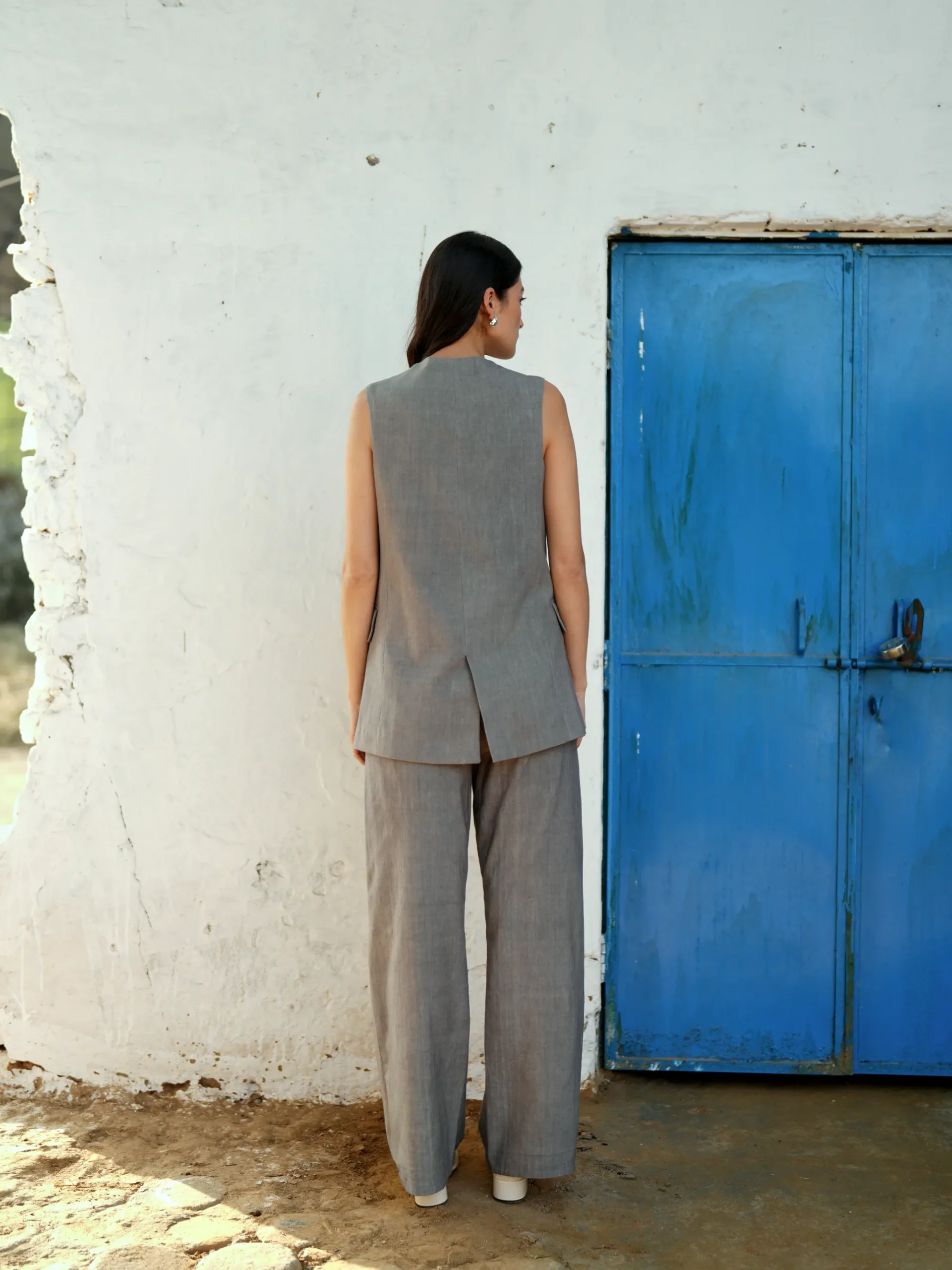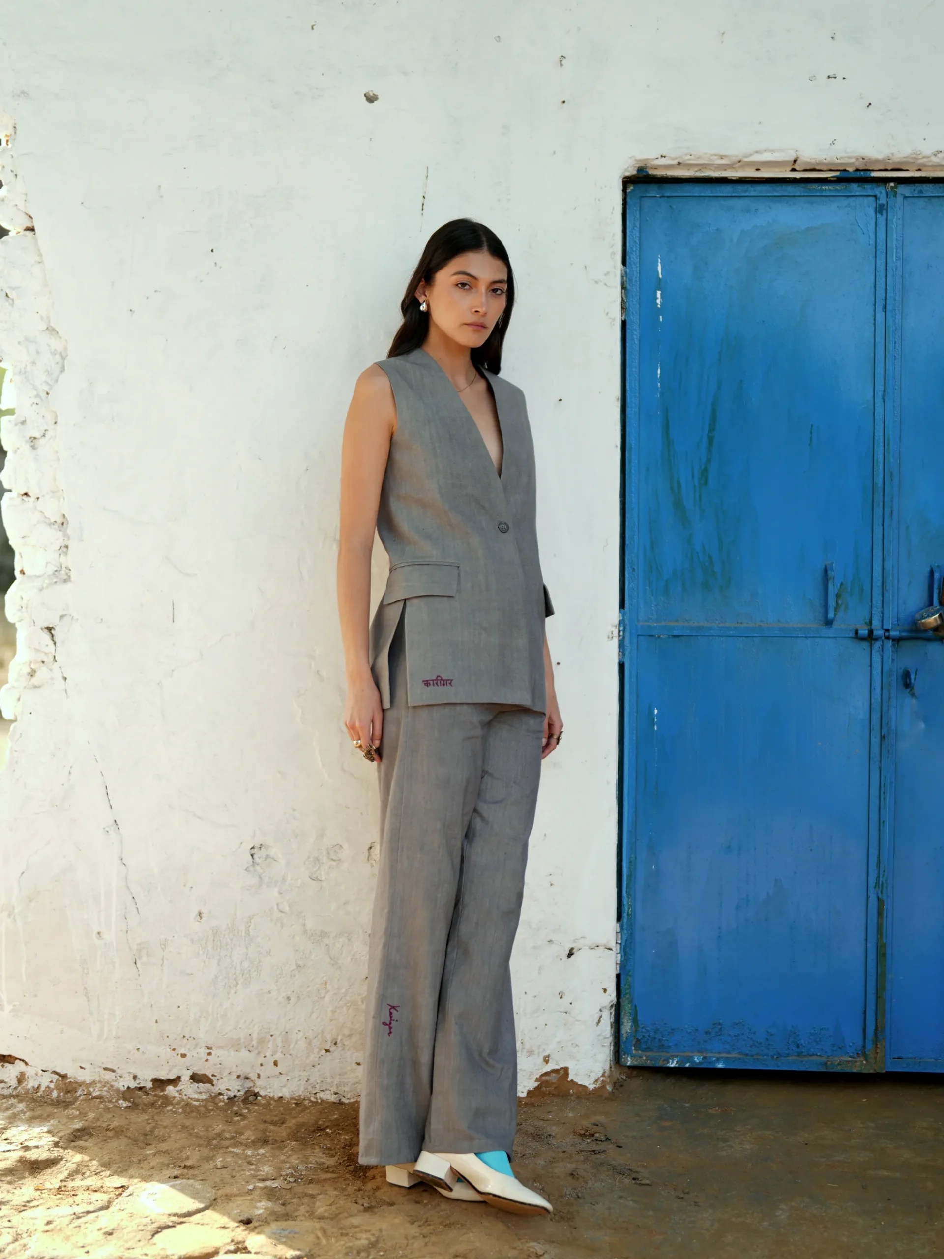 Handwoven khadi coat and trouser set in a graphite grey tone. The coat is tailored with a structured silhouette, front button closure, and front flap pockets for functionality. Matching khadi trousers are constructed in a straight, clean silhouette to maintain a formal profile. The set provides a cohesive, minimal, and polished appearance. Model Details: Model is 5’9
