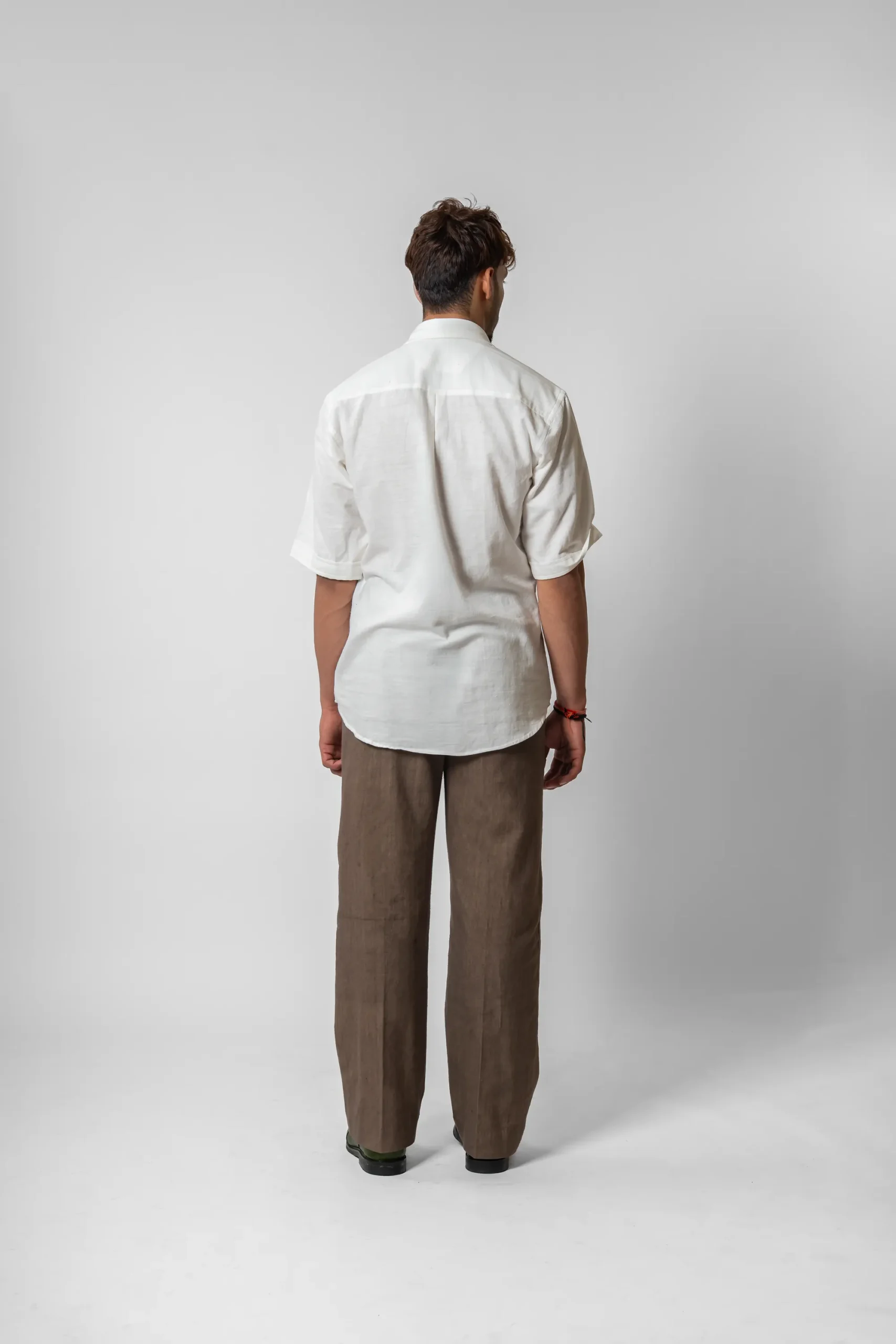 Handwoven khadi shirt and trouser set featuring a white shirt paired with brown trousers. The shirt has a relaxed straight silhouette,and a contrasting line-work patch pocket. The trousers are tailored in a straight, loose cut with a clean finish. The set offers a minimal, structured look with a single graphic detail on the shirt. Model Details: Model is 5’9