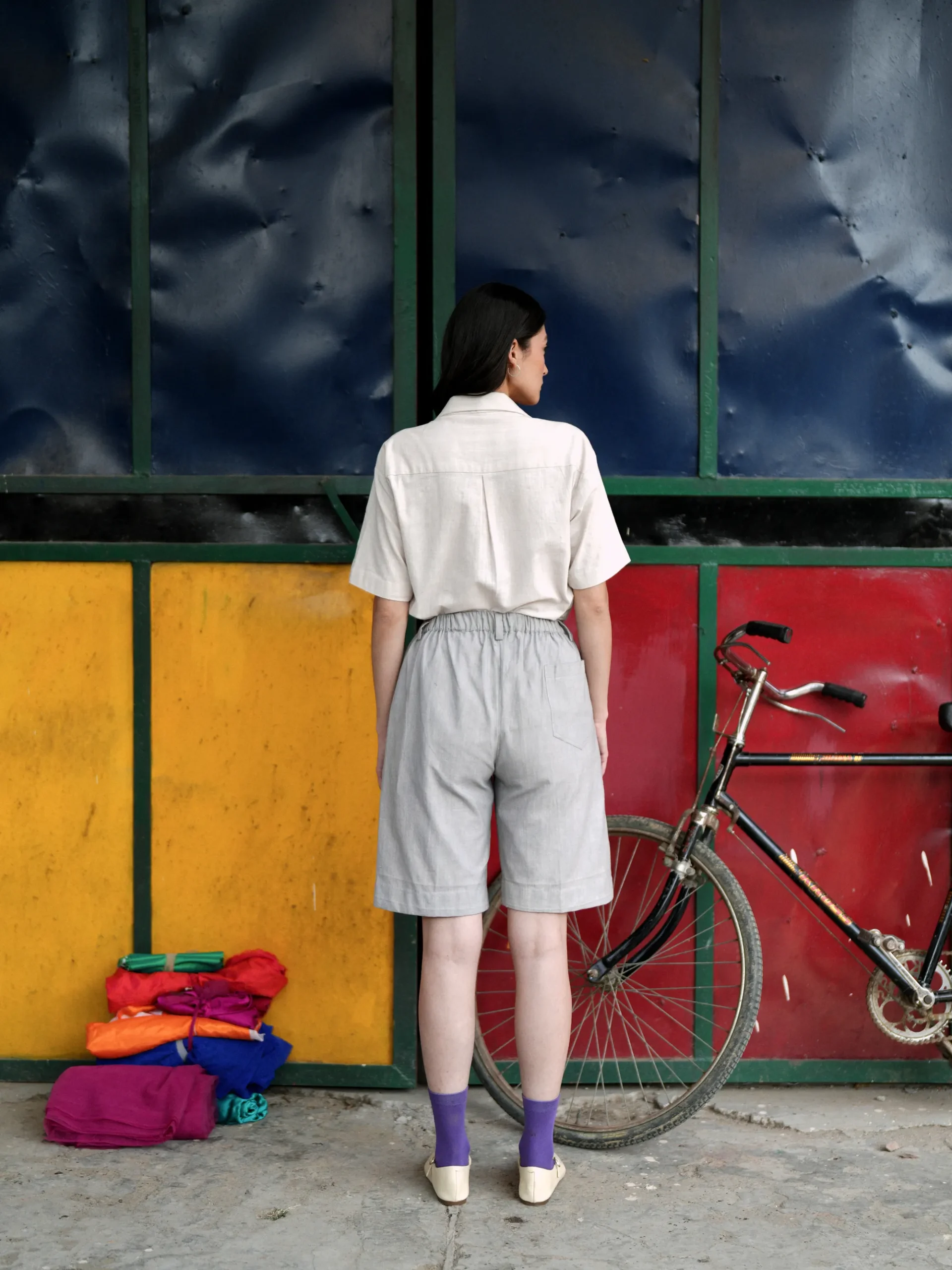 Handwoven khadi shorts in a light grey tone, tailored with a straight silhouette and side pockets. Finished with clean construction to maintain structure and ease. Suitable for coordinated wear with the shirt or independent styling. Model Details: Model is 5’9