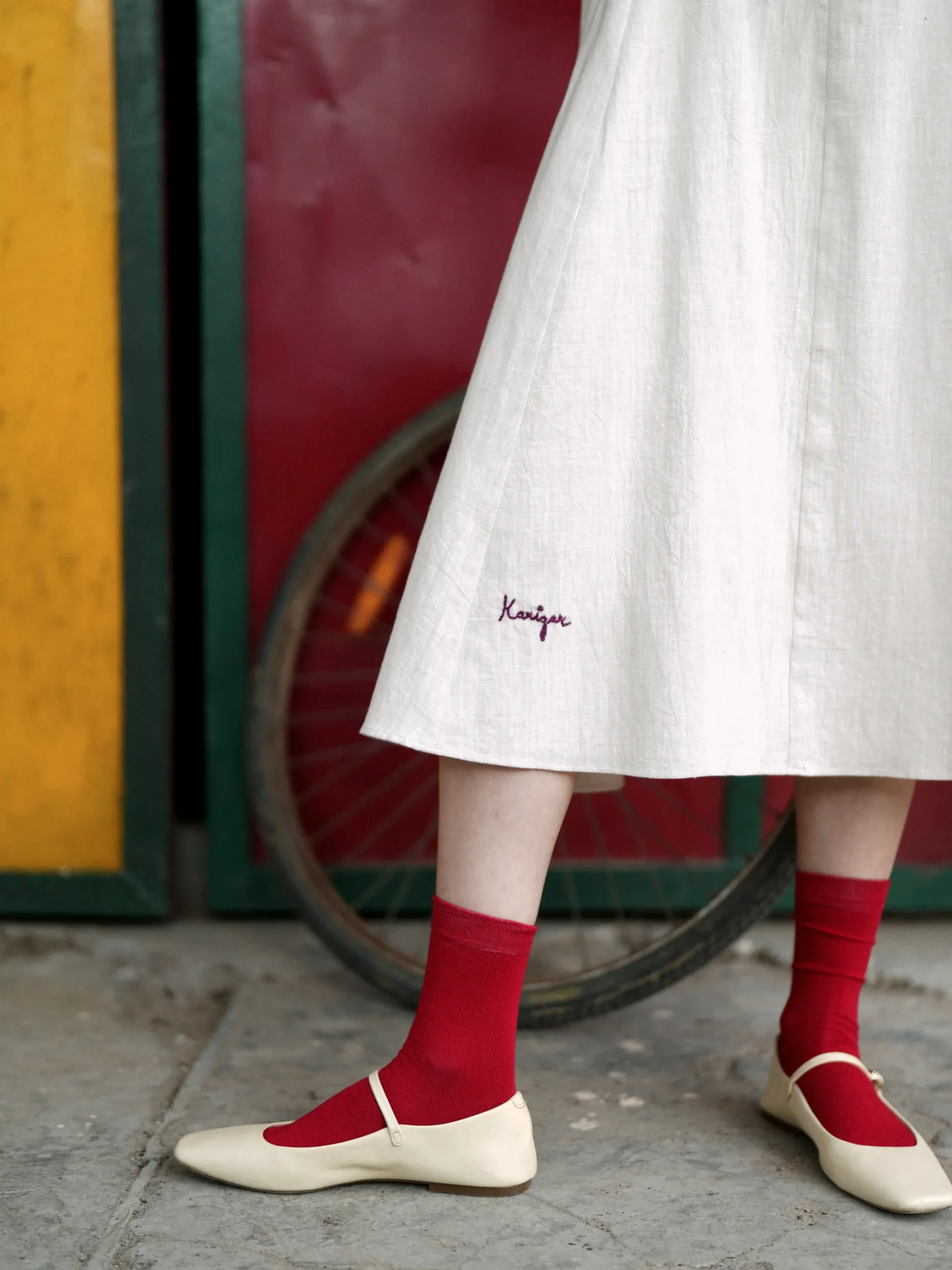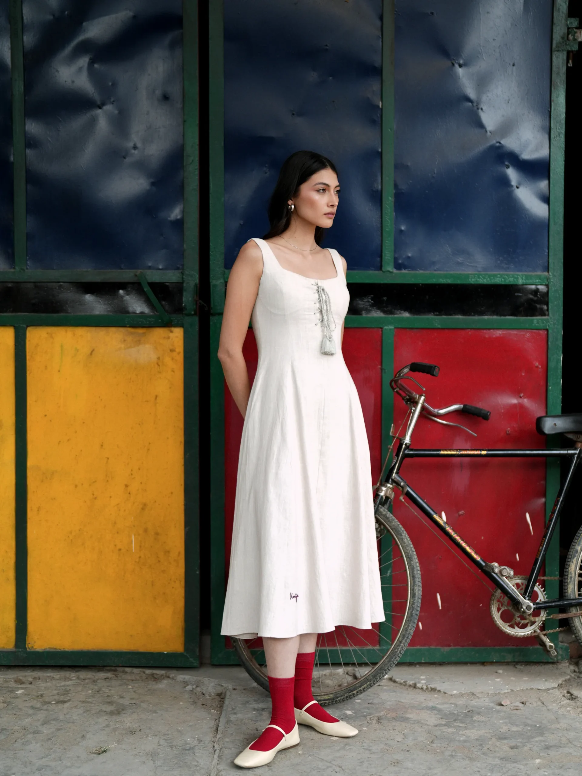 Handwoven khadi dress in a soft, muted white tone with a clean and structured silhouette. Designed with a tying detail in the front and chain in the back to maintain a refined finish. The dress offers a streamlined profile suitable for causal, comfortable, outerwear highlighting the natural texture of khadi. Model Details: Model is 5’9