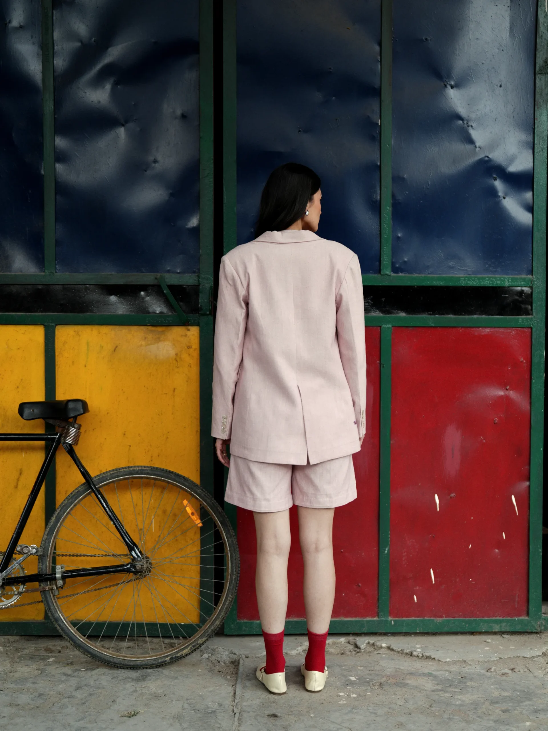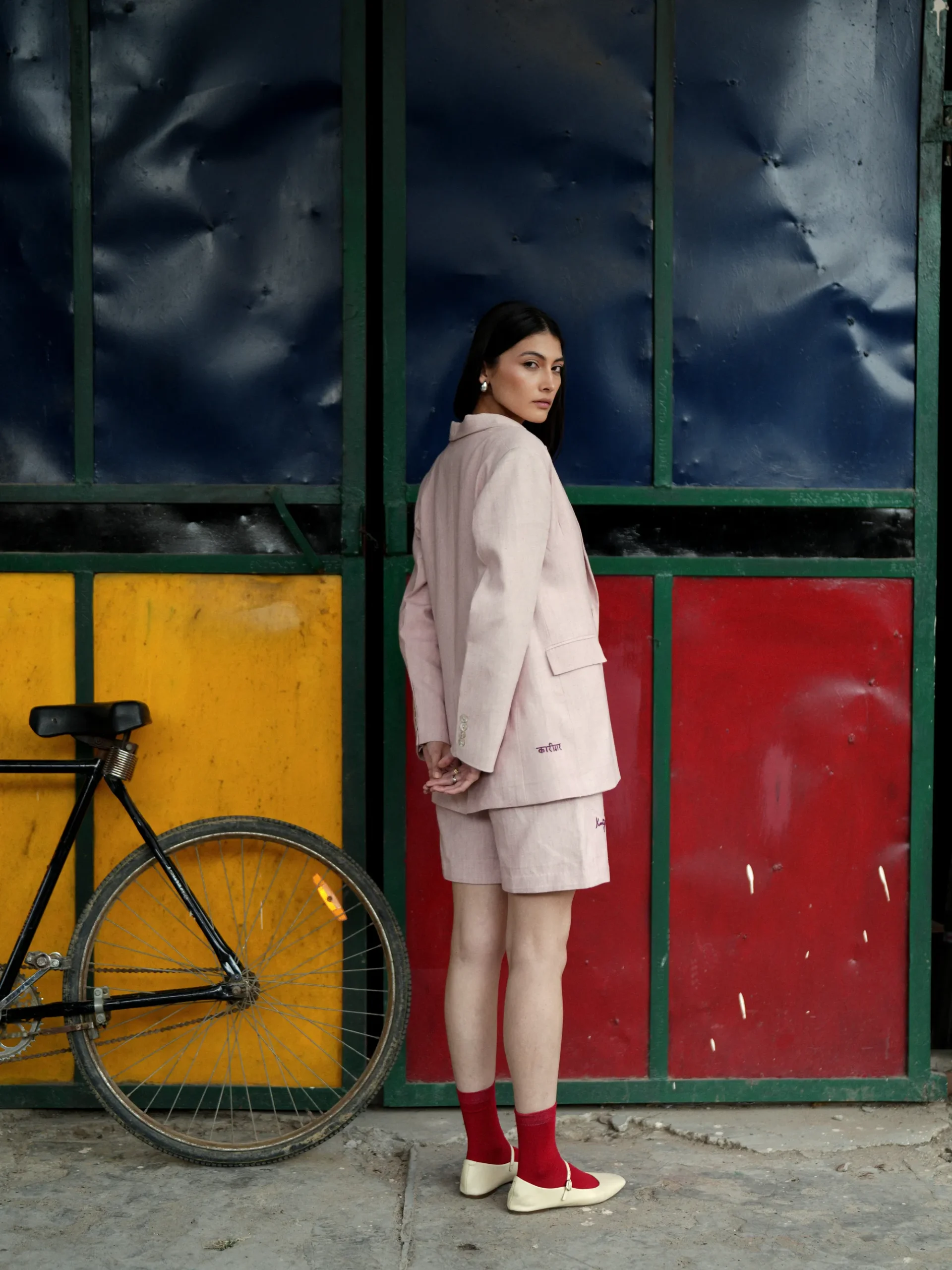 Handwoven khadi blazer set in a light pink tone. The blazer is constructed with a structured silhouette, front button closure, and front pockets for functionality.The waistcoat features a fitted, structured silhouette.It is paired with matching khadi shorts tailored with a straight, easy fit and side pockets for practicality. The set combines crisp tailoring with the natural texture and breathability of khadi. Model Details: Model is 5’9