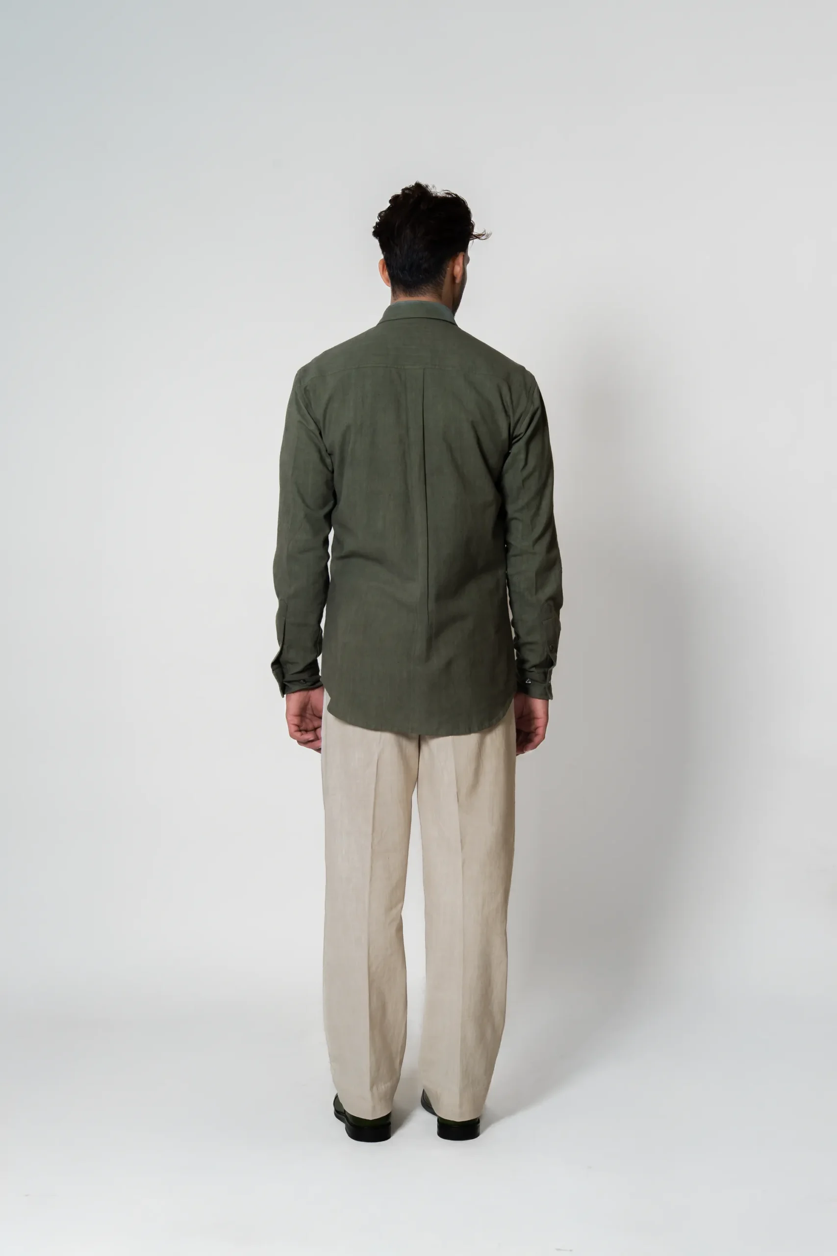 Handwoven khadi shirt and trouser set featuring a muted green shirt paired with white trousers. The shirt is tailored in a straight silhouette with a front button closure and a contrasting textured patch pocket. The white khadi trousers are constructed in a straight, clean cut with side pockets. Together, the set offers a minimal, structured look with a single focal detail on the shirt. Model Details: Model is 5’9